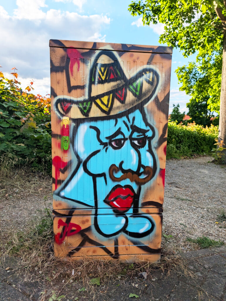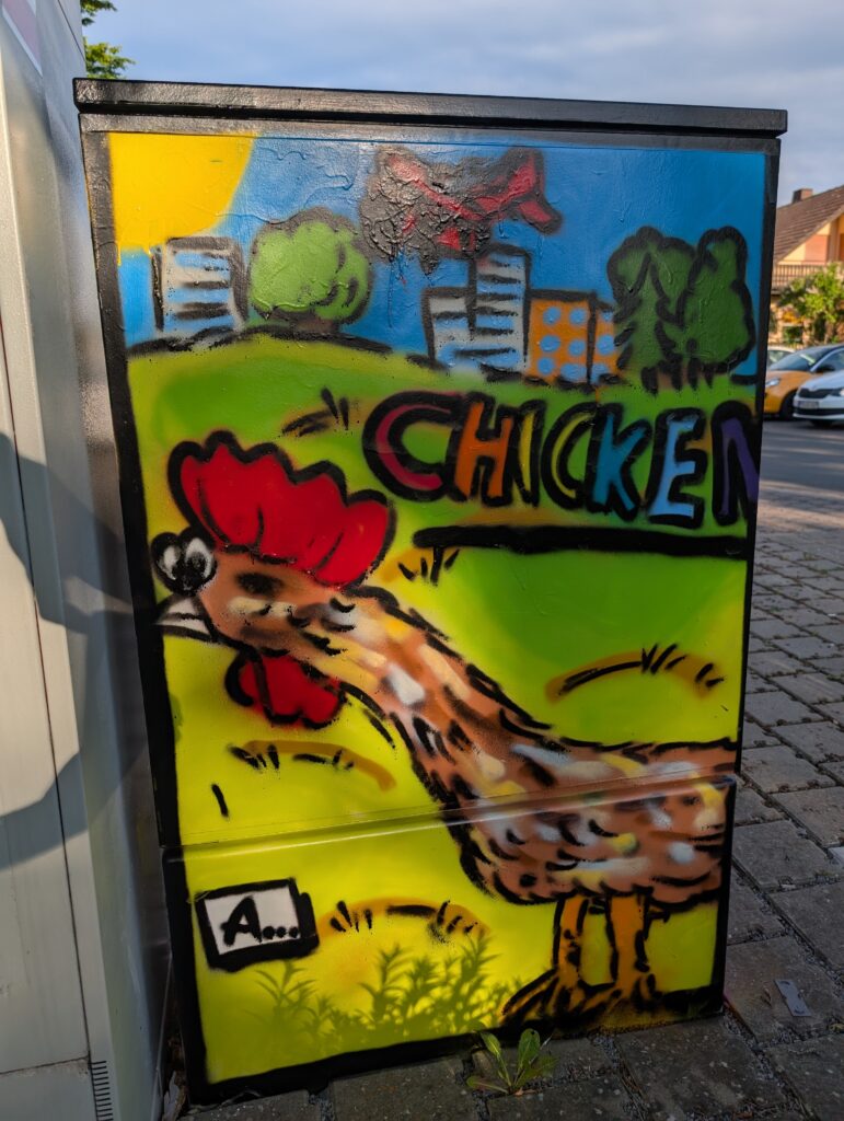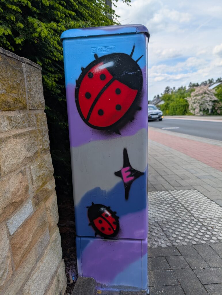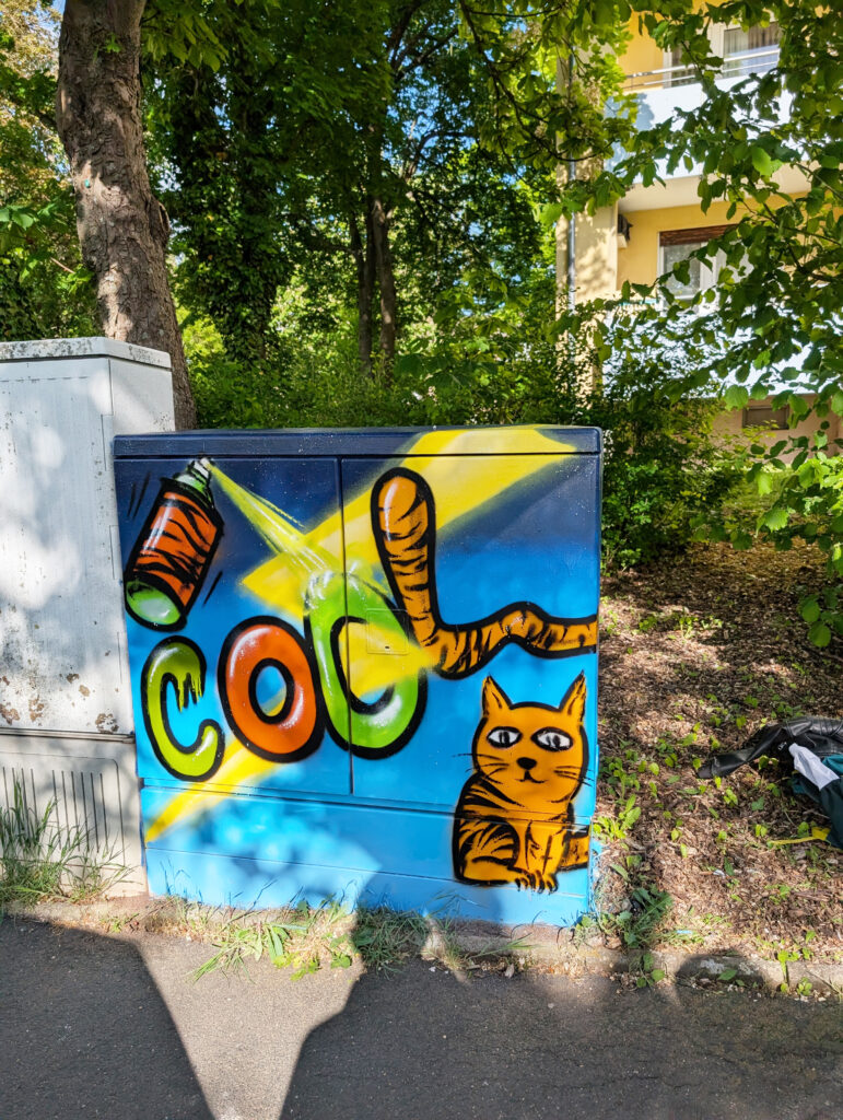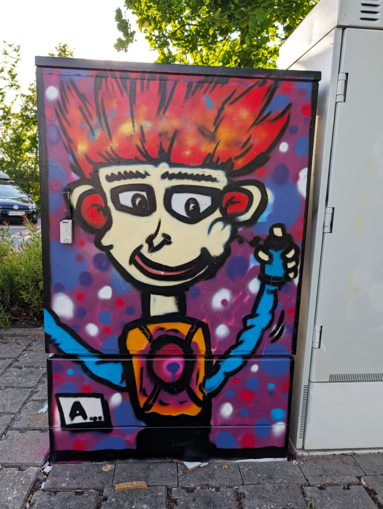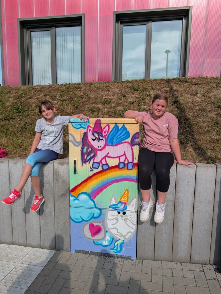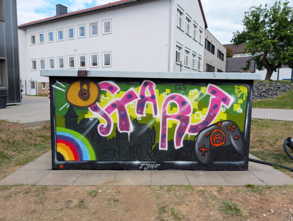 Ein besonderes Projekt durfte ich im hessischen Hünfeld gestalten: Rund um das Schulviertel sollten sechs Stromkästen gestaltet werden. Zusammen mit dem örtlichen Jugendtreff entwarfen die insgesamt 20 Kinder und Jugendlichen unter dem Projektnamen „Kunst am Kasten“ sehr vielfältige Motive, die von Gaming über Einhörner und Regenbogen bis hin zu mexikanischen Memes reichten… An drei Tagen wurden die unterschiedlich großen Stromkästen dann gestaltet. Im Anschluss wurde durch ChatGPT eine kleine Geschichte zu den Motiven erstellt, ich gestaltete noch einen Flyer dazu. Mit diesem können alle einen kreativen Spaziergang rund um das Schulviertel unternehmen und dabei die vielfältigen Kunstwerke erleben. Auch die Presse berichtete über diesen tollen Workshop.