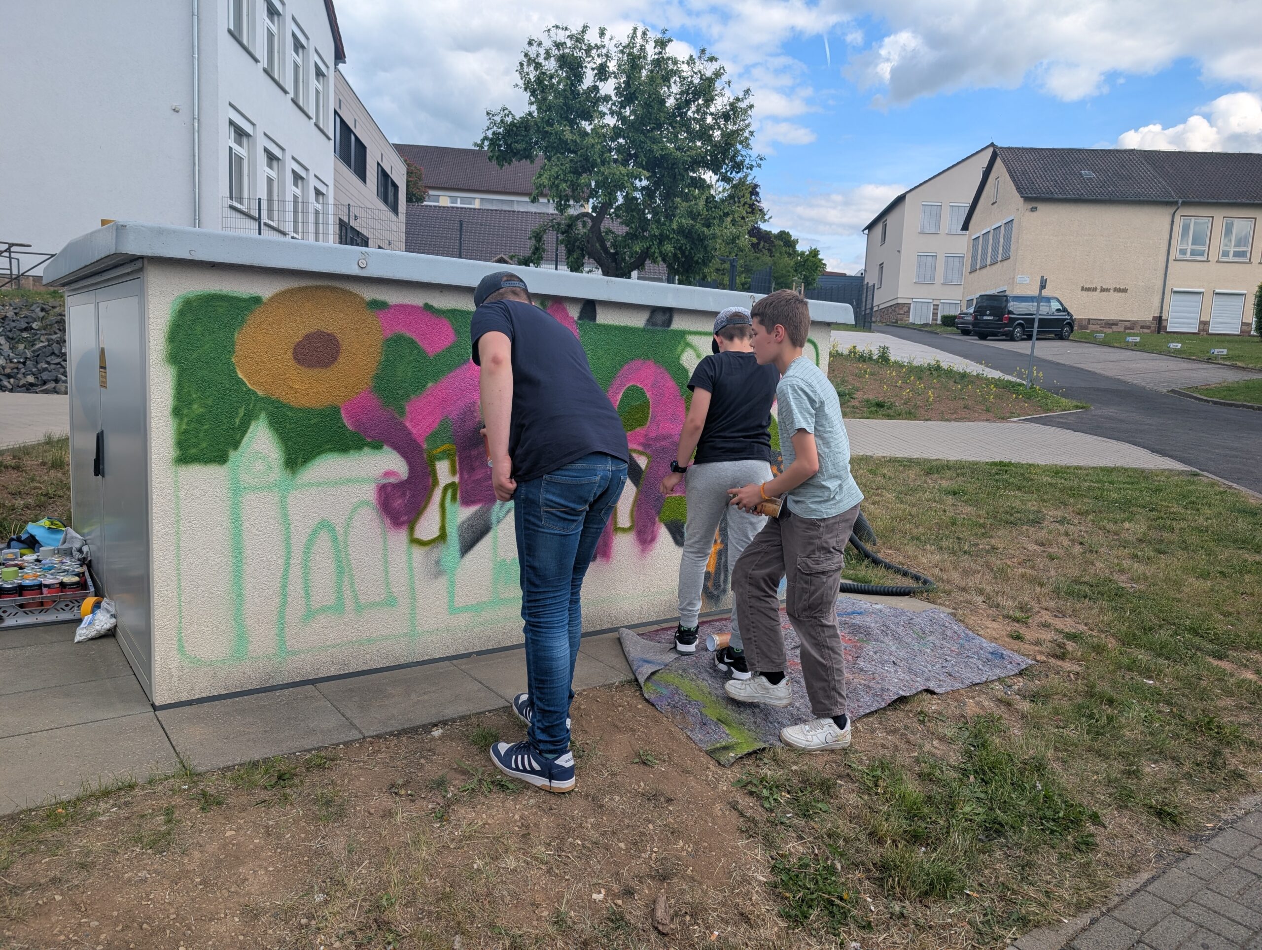 Mai 2025 Ein besonderes Projekt durfte ich im hessischen Hünfeld gestalten: Rund um das Schulviertel sollten sechs Stromkästen gestaltet werden. Zusammen mit dem örtlichen Jugendtreff entwarfen die insgesamt 20 Kinder und Jugendlichen unter dem Projektnamen „Kunst am Kasten“ sehr vielfältige Motive, die von Gaming über Einhörner und Regenbogen bis hin Weiterlesen